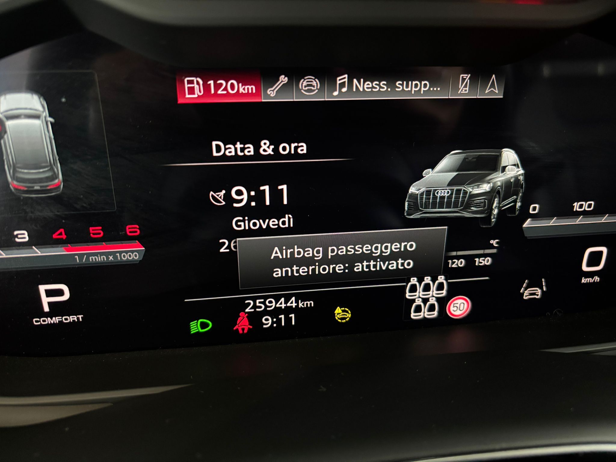 Audi Q7 II 2024 3.0 TDI MHEV S-line – diesel ibrido con cambio automatico. Il tuo SUV a sette posti con soli 25.000 km, completamente esente da incidenti e coperto da garanzia di 24 mesi. Immatricolazione: 08/2024, Chilometraggio: 25.000 km Motore: Diesel/Elettrica MHEV, cambio automatico, 2967 cc, 210 kW/286 PS, Euro 6e Storico: Veicolo aziendale, esente da incidenti Comfort & Convenienza: Climatizzatore automatico 4 zone, tetto panoramico, sospensioni pneumatiche, sedili riscaldati in pelle, regolazione elettrica sedili, portellone posteriore elettrico Sistemi di Guida Assistita: Cruise control adattivo, controllo corsia, parcheggio automatico, telecamera assistita, riconoscimento segnali stradali Intrattenimento & Navigazione: Sistema navigazione, touch screen, Apple CarPlay, Android Auto, hotspot Wi-Fi, volante multifunzione Illuminazione: Fari full-LED antiabbagliamento Sicurezza: Airbag posteriore, riconoscimento stanchezza Equipaggiamento: Cerchi in lega, gancio traino, pacchetto sportivo, pneumatici da neve, pacchetto invernale Consegniamo in tutta Italia Per maggiori informazioni tel 3487230124 Antonio 0425750333 sede di Occhiobello(RO) Veicolo non vincolato al finanziamento